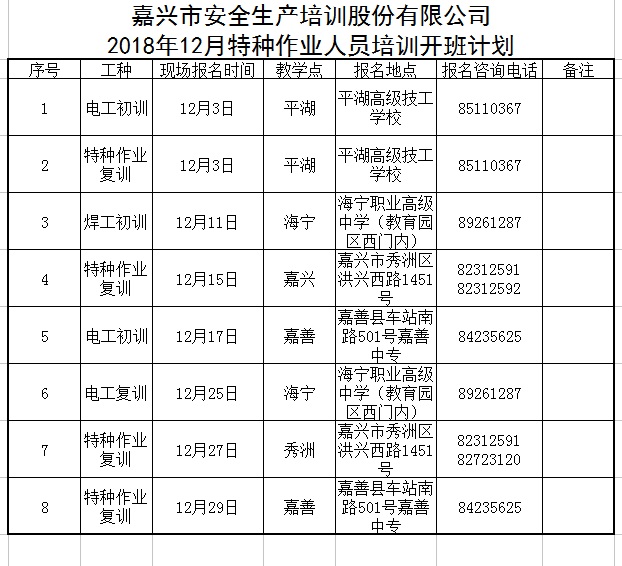 2018年12月特種作業(yè)人員培訓(xùn)開班計劃